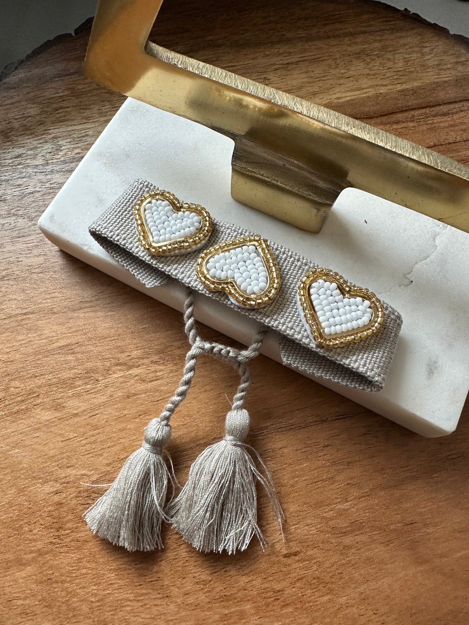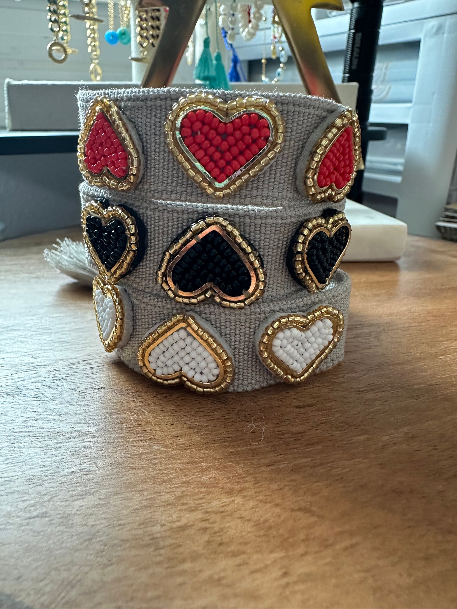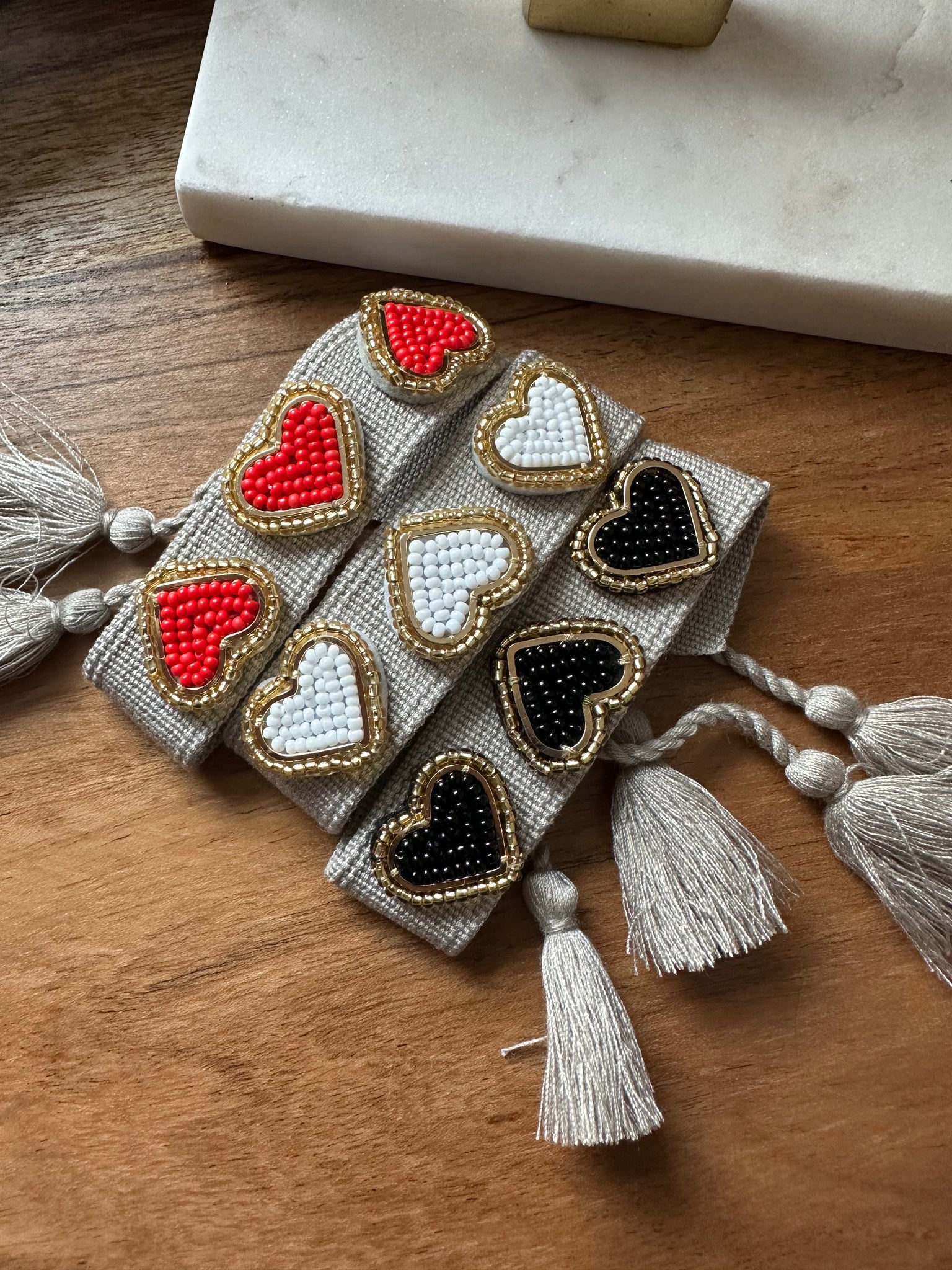 Knit bracelets with evil eyes and hearts with handmade beads